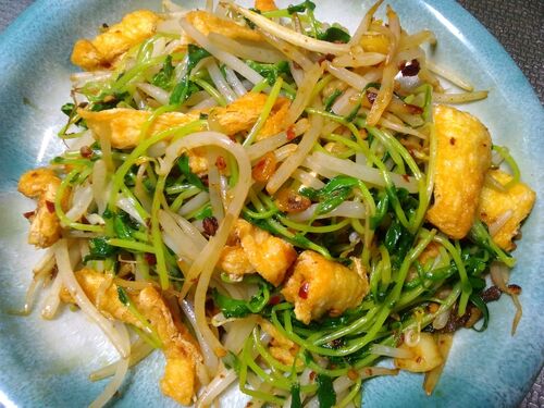 私がラオガンマを使った料理の記事を書くと、大体が植物系ラオガンマを使ったものばかりになるので、肉系ラオガンマを使った料理も紹介しなければ…と思い作ってみたのがコレです。 ▲モヤシと豆苗と薄揚げを刻んだのを一緒に炒めただけですけど、これだけで充…