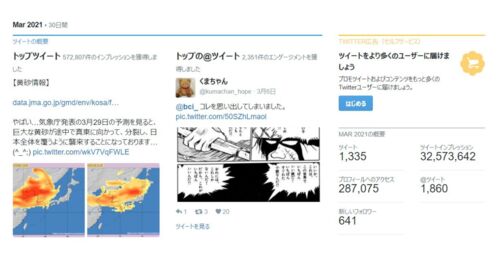 ツイッターには「アナリティクス」と呼ばれるアクセス解析みたいなのがありまして、そこを見ると、どれぐらい自分のツイートを見られているのか、どれぐらいフォロワーが増えたのか…そういうのがわかるようになっています。 ▲詳しくは、こちらをご覧になられ…